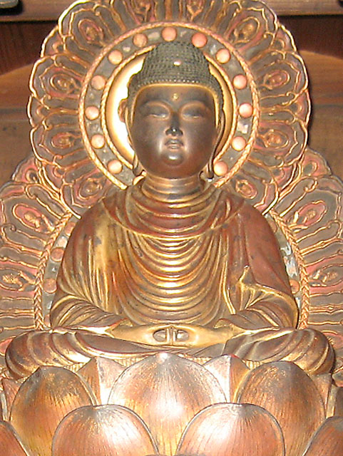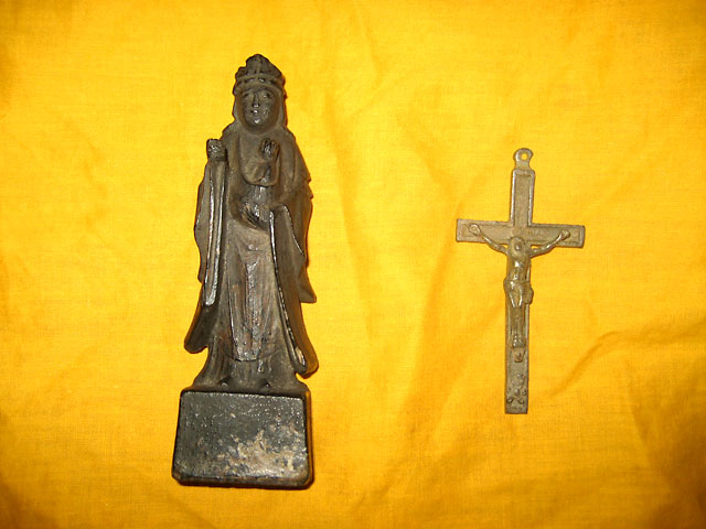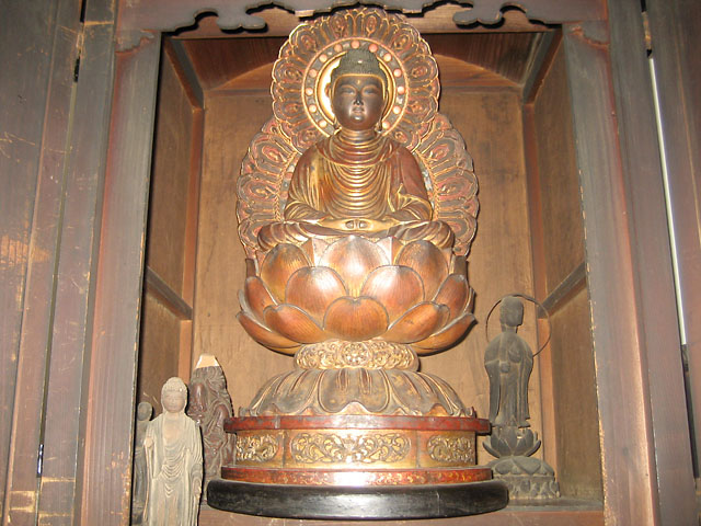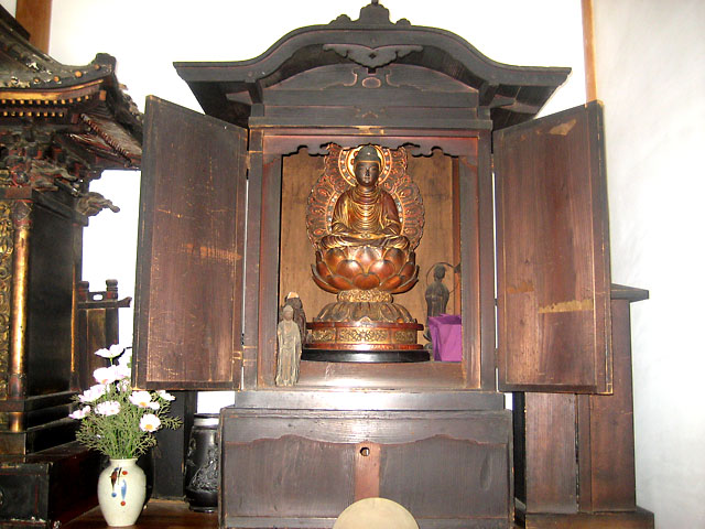 この阿弥陀如来坐像は、埼玉県下でも、数少ない隠れキリシタンに関する貴重な遺物です。寄木造りの漆箔着色で、造高29.3㎝、胸張22.2㎝です。首が胴部から抜けるようになっており、像内には檜材一本造りの股張16.2㎝マリア観音像(高さ13.0㎝)と胴造十字架(高さ8.7×4.0㎝)が収められています。
