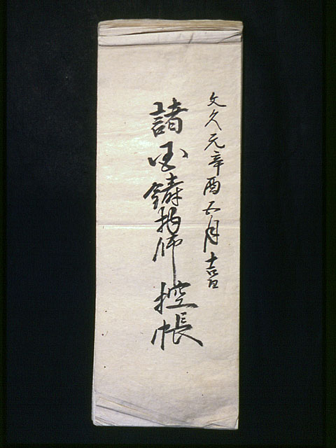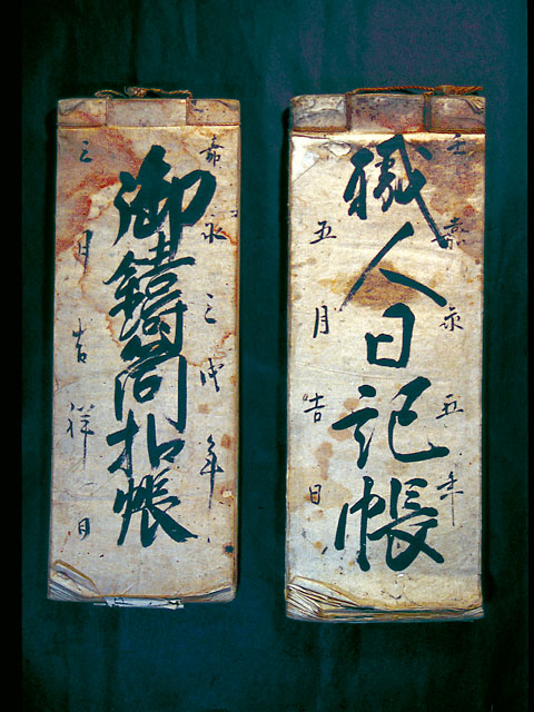 増田家は、代々鋳造業を営み、幕末には幕府御用鋳物師として活躍し、その技術力の高さは当時の鋳物師の中でも抜群であったといわれています。この史料は、当時の川口鋳物業の近代化の過程を知る上で貴重です。安政2年(1855)の「御用留」は幕府方と工場の連絡簿であり、嘉永3年(1850)の「御鋳筒控帳」や「鋳造控帳」は鉄砲や砲玉の製造数を記録したものです。