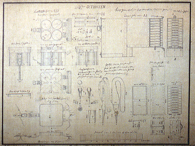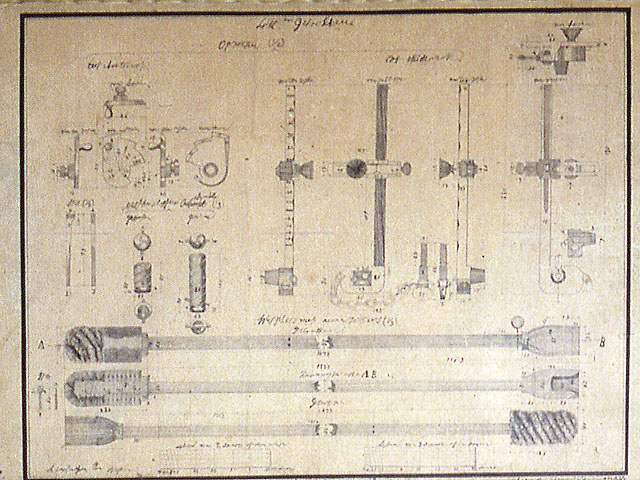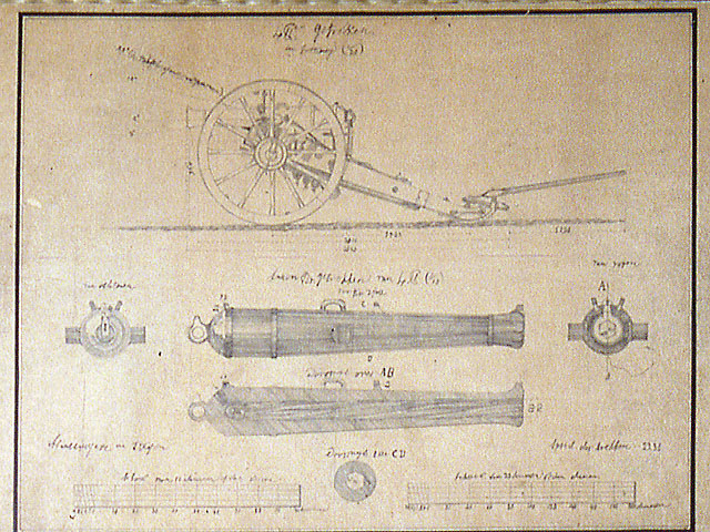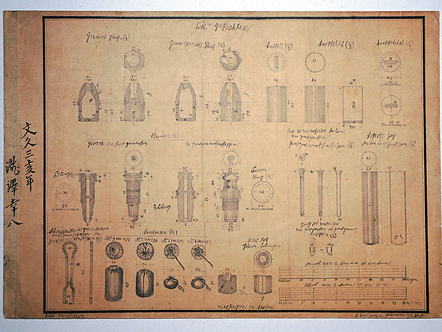 文久3年(1863)、川口鋳物師瀧沢幸八が和紙に烏口を用いて筆写した鋳造製大筒(大砲)や弾、付属器材の設計図4枚です。オランダ語に近似した文字が書かれており、鋳物製造技術の近代化の過程における進取の様相を示す貴重な資料です。