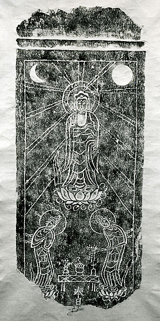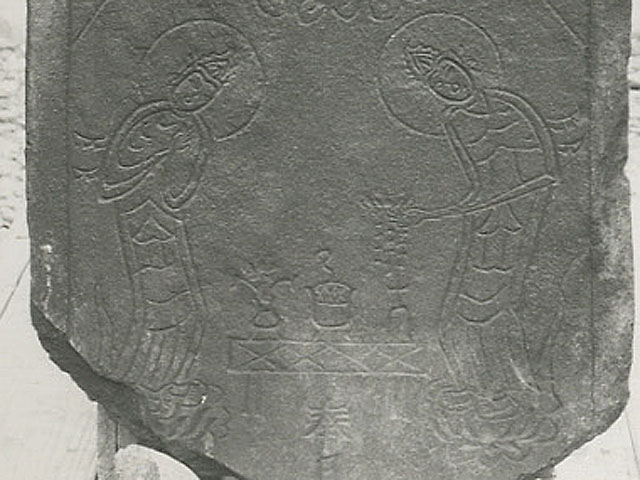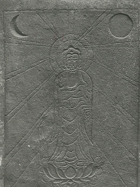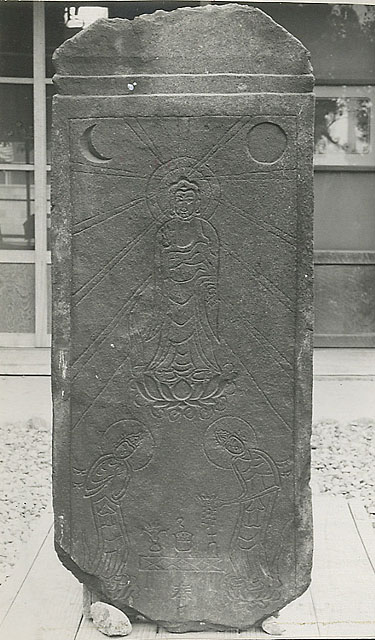 年代は不明ですが、阿弥陀三尊(阿弥陀如来・観音菩薩・勢至菩薩)と蓮台、机と三具足の図象を線刻した板碑です。里にあった興福寺跡から出土したと伝えられます。
