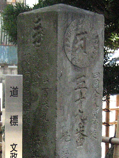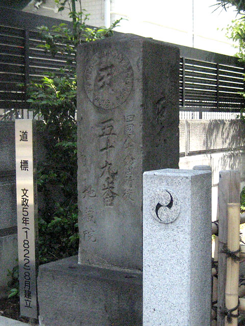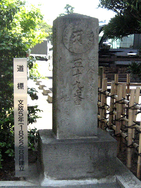 文政5年(1822)に日光御成道から越ヶ谷道が分岐する場所に建立された道標です。「これより右こしがや道二里」と刻まれています。また、隣接する地蔵院が、四国八十八箇所を川口市周辺の寺院に見立てて巡拝する新四国八十八箇所巡りの五十九番札所であったことから、札所の標識も兼ねています。