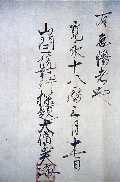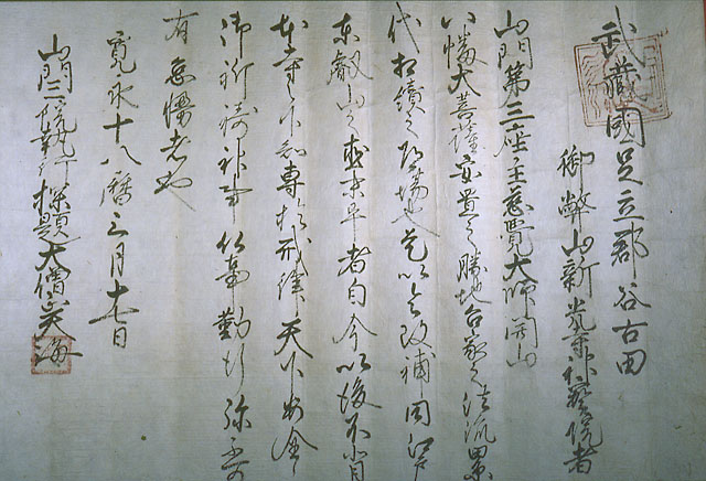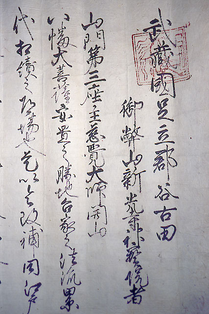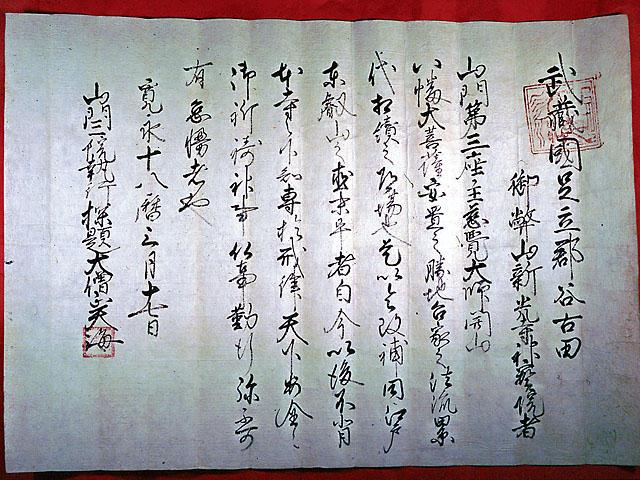 「新光寺縁起」によると、奥州討伐の源義家を助けるために奥州に向かった弟、新羅三郎義光が峯ヶ岡八幡神社の別当寺として建立したとされています。古文書の中には、「大般若波羅密多経」の写本や寛永18年(1641)天海の記した「谷古田八幡宮御幣山新光寺神宝院」など大切な史料が多くあります。