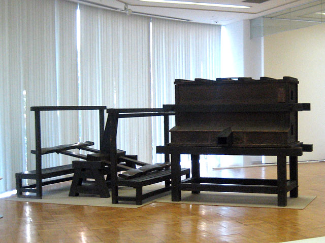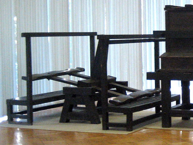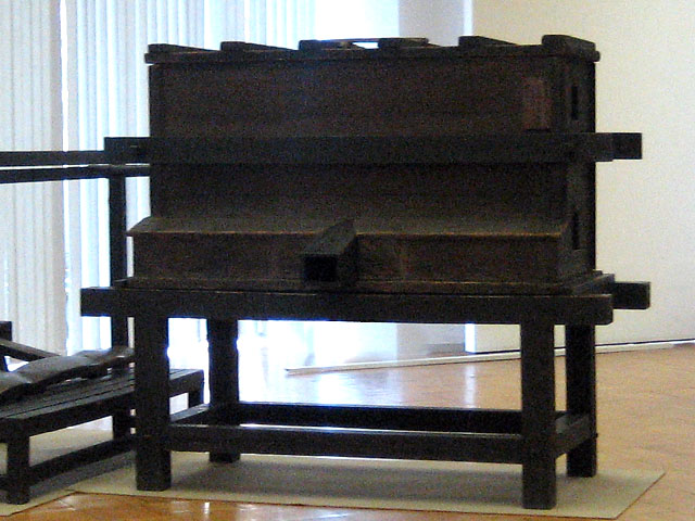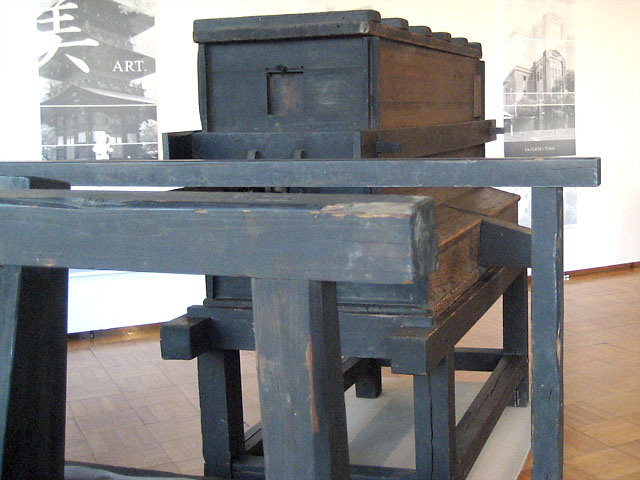 このだるま鞴(踏たたら)は、明治時代に、明治10年代まで使用されていた「タタラ」に代わり甑銑鉄溶解用の送風に用いられていた足踏み送風機です。本市の鋳物業界では、この頃から次第に銑鉄の溶解は従来の木炭に代わりコークスが用いられるようになりました。10人一組のうち8人が片側4人ずつに分かれ、脚を合わせて踏み板を踏み、主軸を往復させて送風します。この時踏み子たちによって歌われた作業歌が「たたら節」の原型と言われています。川口鋳物業の近代化を物語る重要な資料です。