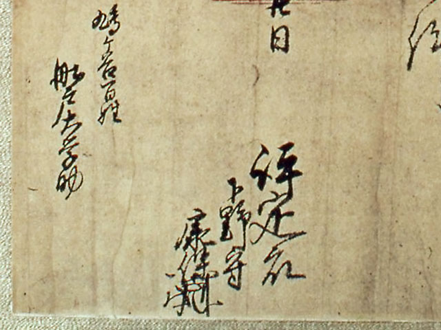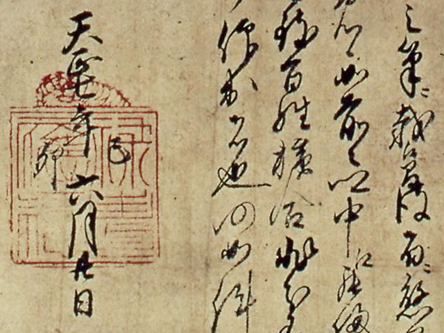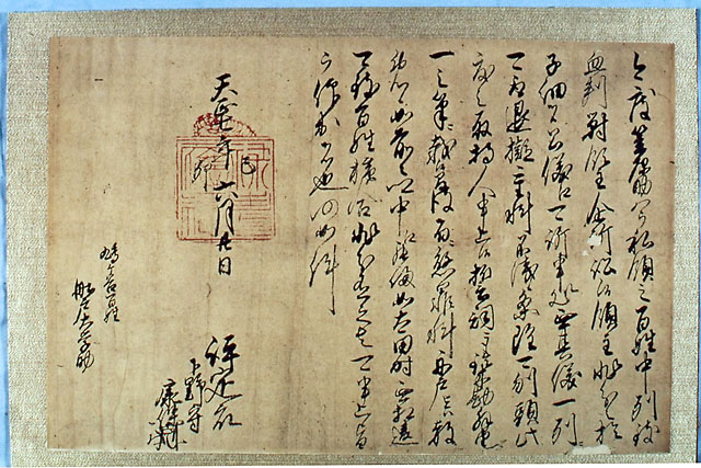 天正7年(1579)に関東一円を支配していた北条氏の評定衆が鳩ヶ谷の船戸大学助に宛てた書状です。鳩ヶ谷周辺の村人達が、当地の代官であった笠原氏に反抗し、逃散を企てたことに対する判決が記されています。当時の地方支配の状況を知る上で貴重な資料です。