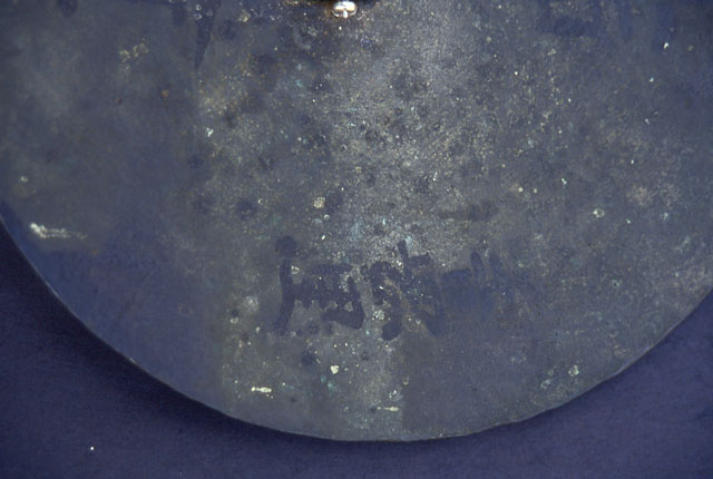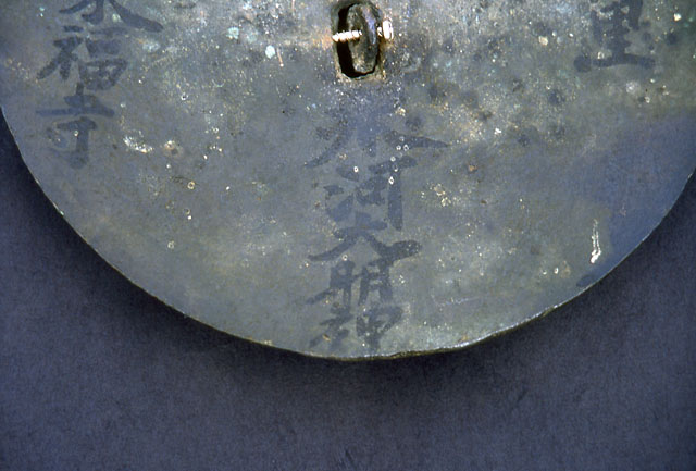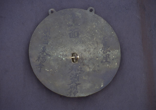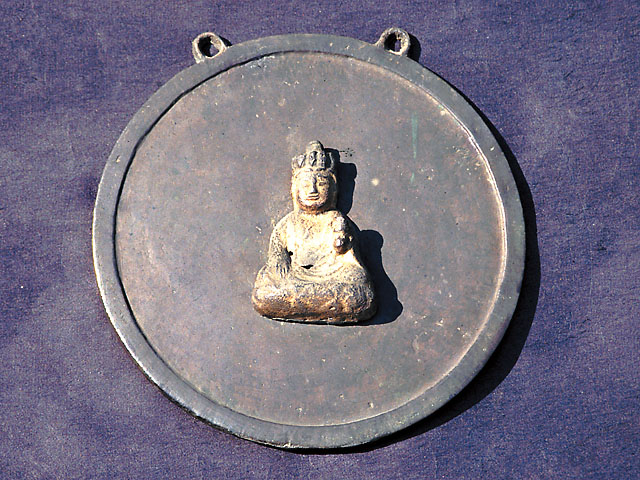 この懸仏は、作風から見て、室町時代後半期の作と思われ、鋳銅製で、中央に別鋳の十一面観音像を配しています。直径18.3㎝、厚さ0.5㎝です。もとは、安行村吉岡組の鎮守神明社の本地仏として奉納された懸仏で、中世に柱や壁などにかけて盛んに礼拝されました。その後神明社は、江戸時代後期に、現在の氷川社に合祀され氷川神社に伝えられているものです。