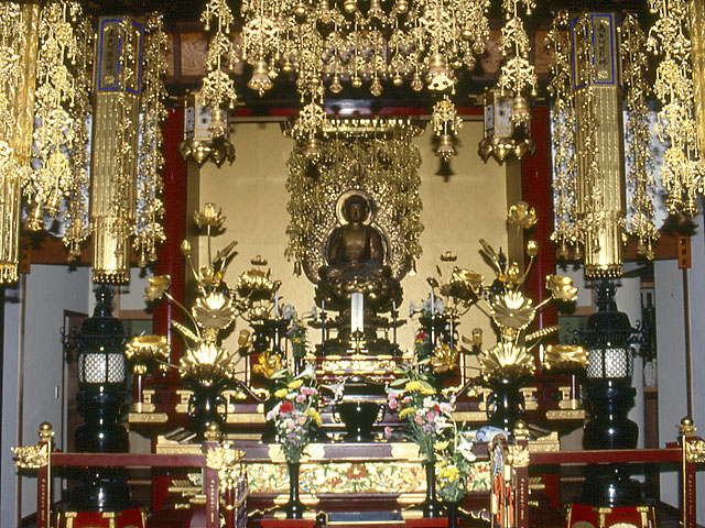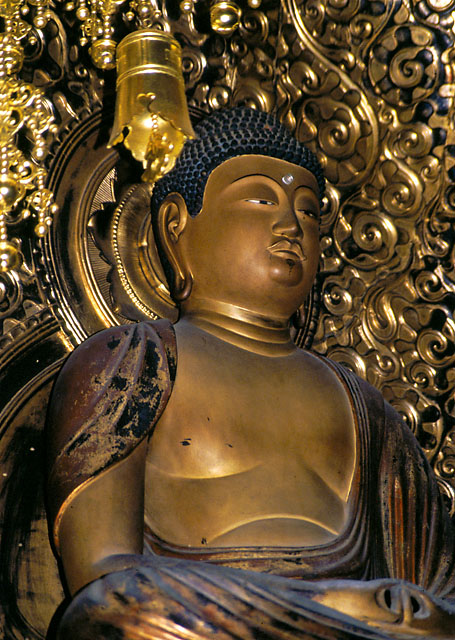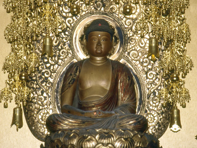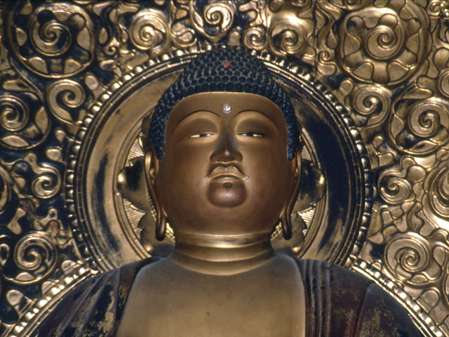 この阿弥陀如来坐像は源長寺の本尊で、木造(榧材か)寄木造りで、像高88.5㎝、定朝様式を忠実に受け継いでいます。背面中央に「聖蓮社冏誉蘆含和尚」の朱字銘が認められます。冏誉蘆含は、源長寺六世天冏の弟子、寛文13年(1673)に21歳で入寂しており、相当身分の高い人か伊奈氏の一族と推定されます。