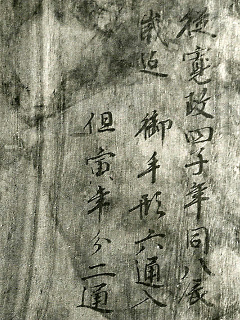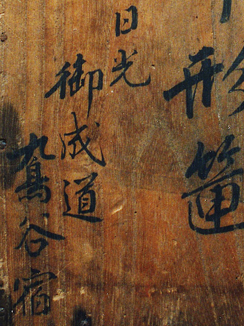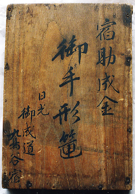 道中奉行から鳩ヶ谷宿に支給された助成金の手形を保管するための箱です。桐材で、大きさは縦24cm、横17cm、深さ3.8cmです。墨書によると寛政4年(1792)から同8年にかけて支給された手形が入れてありました。鳩ヶ谷宿において公用で使用された器物として現存唯一の資料です。