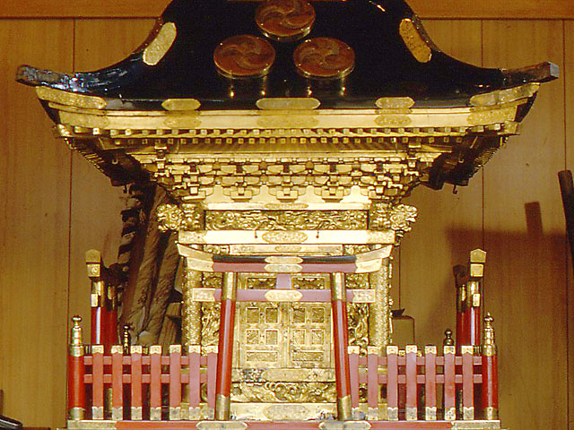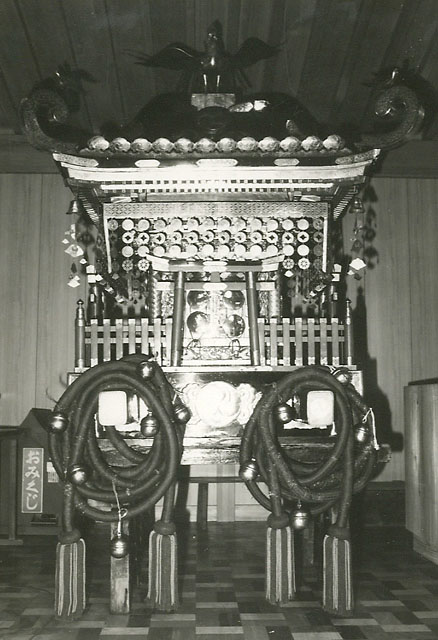 鳩ヶ谷宿の鎮守社である氷川神社の神輿です。別名「百貫みこし」と称され、夏の天王様の祭りで担がれました。嘉永5年(1852)頃に鳩ヶ谷宿の若者達が周囲の反対を押し切って奉納したとの伝承があります。意匠は江戸神輿の典型を示すとみられ、近世末期の民俗資料として貴重です。
