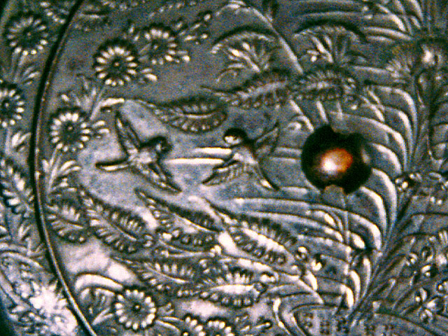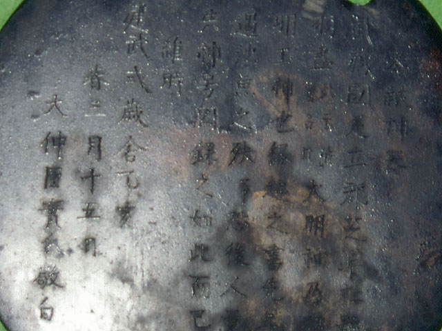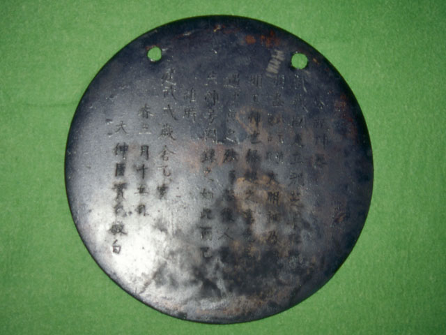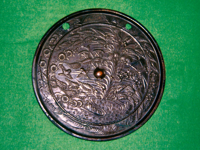 この秋草双雀鏡は、神器として羽盡神社に奉納されたもので、背面には秋草の咲き乱れる中で、2羽の雀が飛び交う様子が鋳出されており、鏡面に刻まれた銘文から建武2年(1335)に奉納されたものであることが判ります。直径19.0㎝、厚さ0.1㎝(縁の厚さは0.3㎝)の円鏡です。