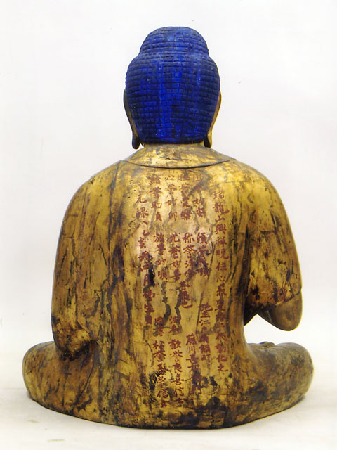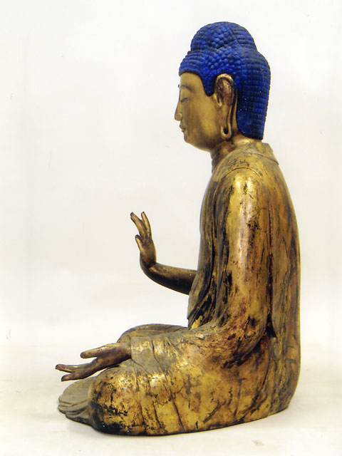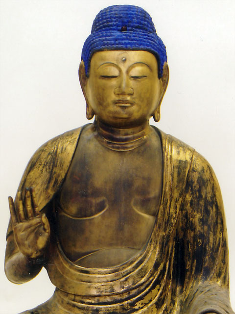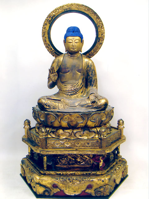 この釈迦如来坐像は、檜材の寄木造りで、彫眼、肉身部は金泥彩、衲衣部は錆地に黒漆で漆箔を施しています。本像は、定朝様式の特徴をよく受け継いだ穏和な作風を見せながらも、衣文線などに形式化が見られ、細部に写実的な表現も認められることから、平安時代末の作と考えられます。