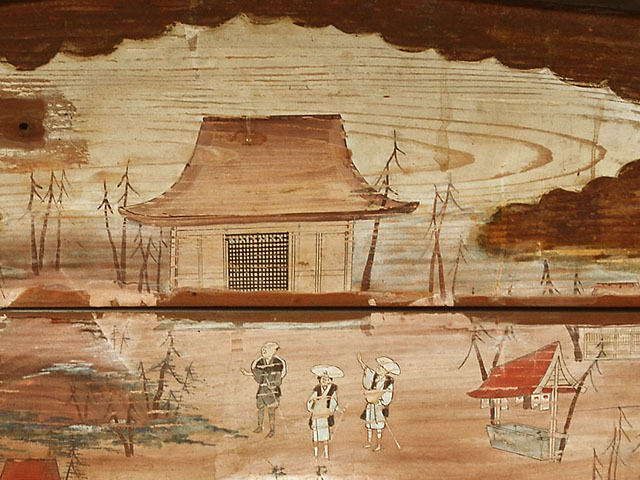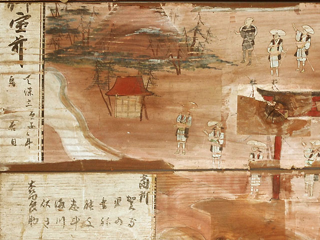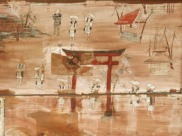 この絵馬は、かつて浅間神社と呼ばれ地域の富士信仰の拠点であった当神社の、天保11年(1840)当時の境内を描いたものです。社殿に赤鳥居、見沼代用水東縁と富士塚、白装束姿の参拝者8人等が描かれています。女人講中による奉納であることなど、地域の富士信仰の様子が窺い知ることが出来る貴重な資料です。