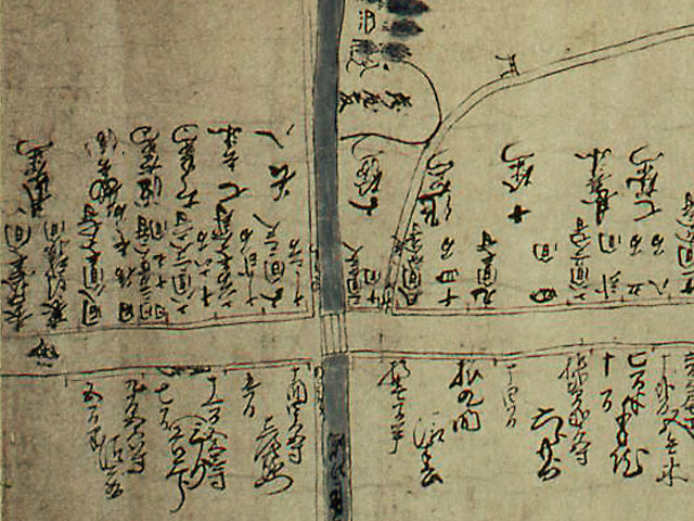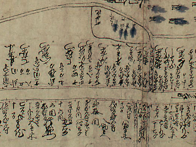 鳩ヶ谷宿に軒を連ねる屋敷の間口、奥行き、当主の名前を記した絵図です。氷川神社や千手院などの寺社も描かれています。後の見沼代用水を「渕江用水」と記しており、見沼代用水が完成する享保13年(1728)以前に作成されたと推察されます。江戸前期における鳩ヶ谷宿のようすを知ることができる貴重な資料です。