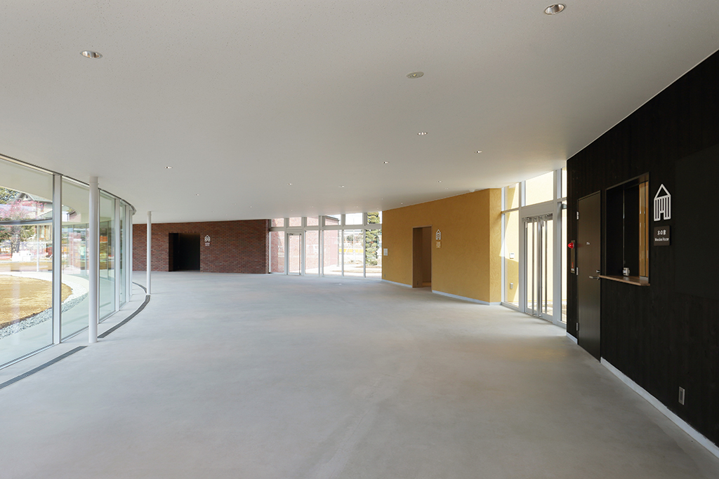 3つの「家」をつなぐ、ガラス貼りの解放感あふれる空間です。