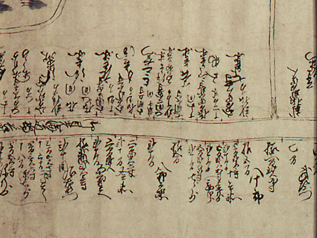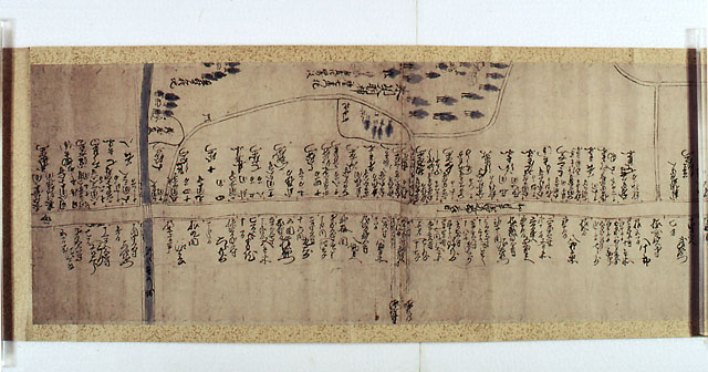 鳩ヶ谷宿に軒を連ねる屋敷の間口、奥行き、当主の名前を記した絵図です。氷川神社や千手院などの寺社も描かれています。後の見沼代用水を「渕江用水」と記しており、見沼代用水が完成する享保13年(1728)以前に作成されたと推察されます。江戸前期における鳩ヶ谷宿のようすを知ることができる貴重な資料です。